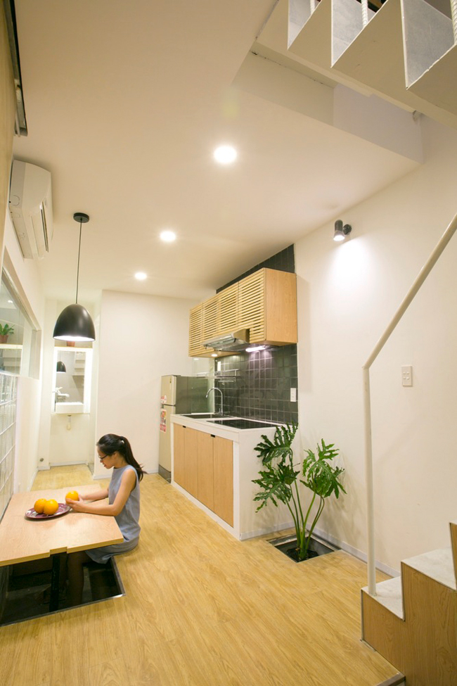 Sàn nhà được tận dụng làm ghế ngồi, bàn ăn kiểu Nhật gắn trực tiếp vào sàn, khoảng trống bên dưới là chỗ để chân y như trong các nhà hàng lẩu nướng kiểu Hàn, Nhật.
