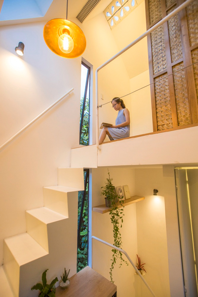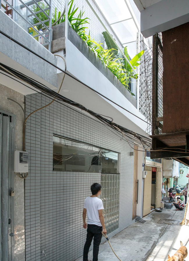 Dù nhỏ nhưng căn nhà vẫn có được không gian xanh nhờ những hộp cây từ ban công tầng trên.