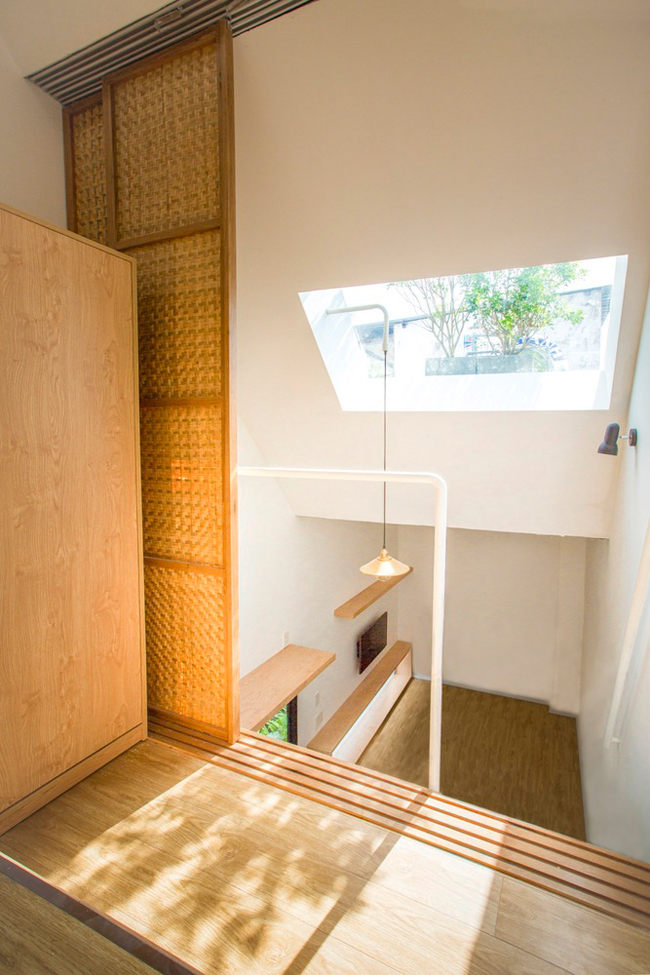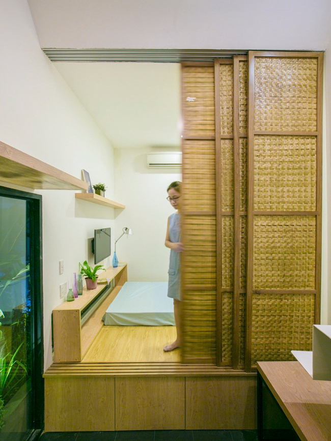 Phòng ngủ được sử dụng cửa lùa tre để đảm bảo không gian riêng tư, vừa lịch sự vừa tiện lợi. Đồng thời, sàn phòng ngủ cũng được nâng để không gian dưới phục vụ việc lưu trữ. Tất cả những yếu tố chủ chốt này làm cho không gian ấm cúng dường như rộng hơn và nhẹ hơn.